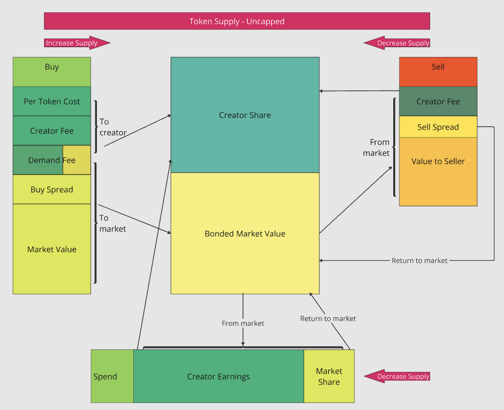 - Any value not allocated to the creator remains in the market value of tokens and increases the market value of all remaining tokens.