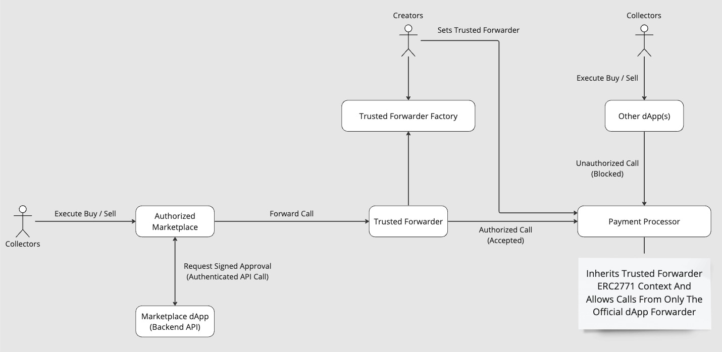 Creators may configure Payment Processor to only allow transactions that originate through specific channels (see add trusted channel) which, combined with a permissioned forwarder, allows creators to enforce their sales to be routed through specific frontend interfaces.